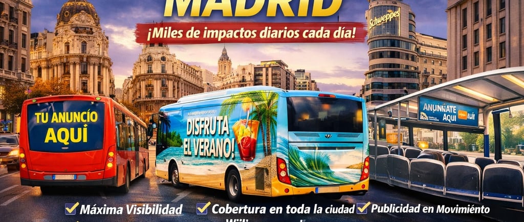 Madrid cuenta con una de las redes de transporte público más amplias de Europa. Los autobuses recorren centros urbanos, avenidas principales, zonas comerciales y áreas periféricas, lo que permite que una campaña publicitaria alcance audiencias muy diversas.